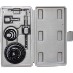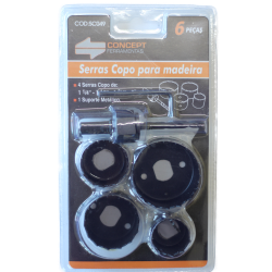 Para perfuração de madeiras, este jogo de serra contém 05 copos, 01 suporte metálico, 01 encaixe e 01 chave allen.